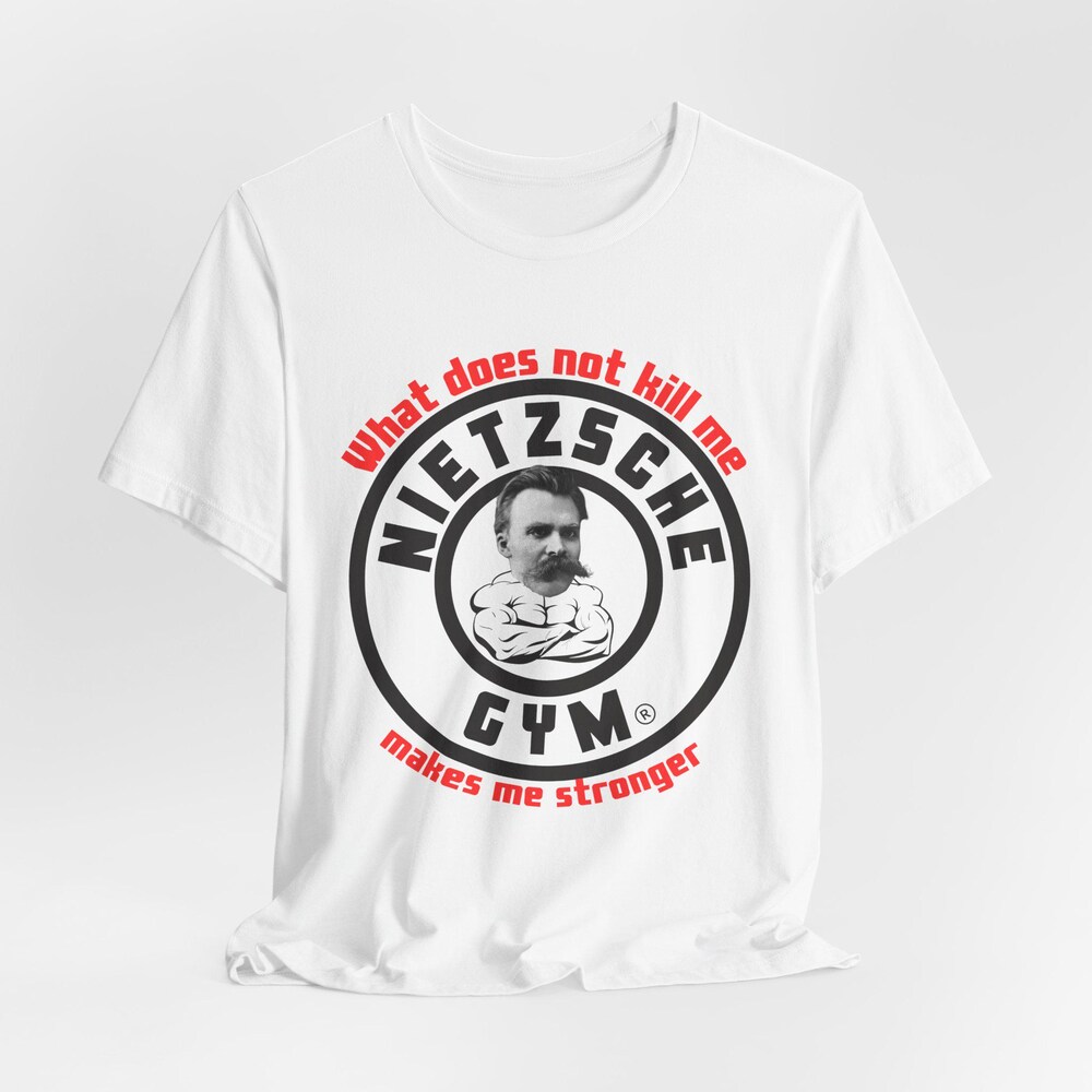 Nietzsche Fitness T-Shirt – “What Does Not Kill Me Makes Me Stronger” – Nietzsche Gym Parody Tee – Philosophy Meets Fitness
