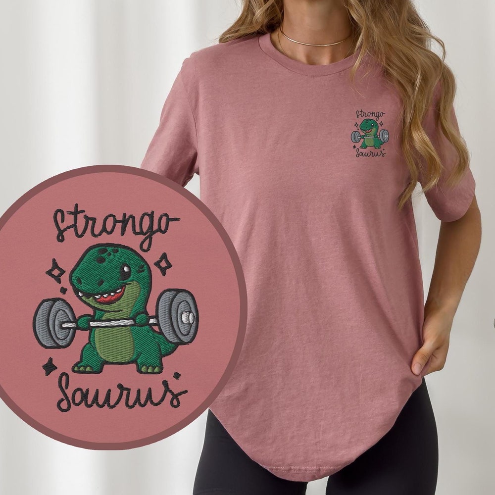 Strongosaurus Embroidery T-Shirt Cute Dino in the Gym | Bella Canvas 3001 | Funny Fitness Clothing Unisex | pump cover | Dinosaur Shirt