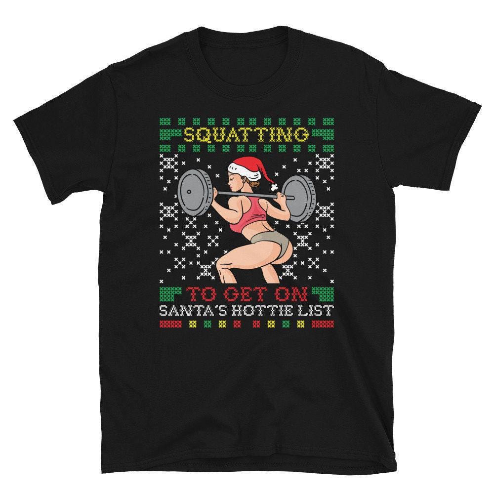Squatting To Get On Santas Hottie List Ugly Christmas Sweater Gym Miss Santa Claus Squat Booty Body Building Fitness T-Shirt Men Women