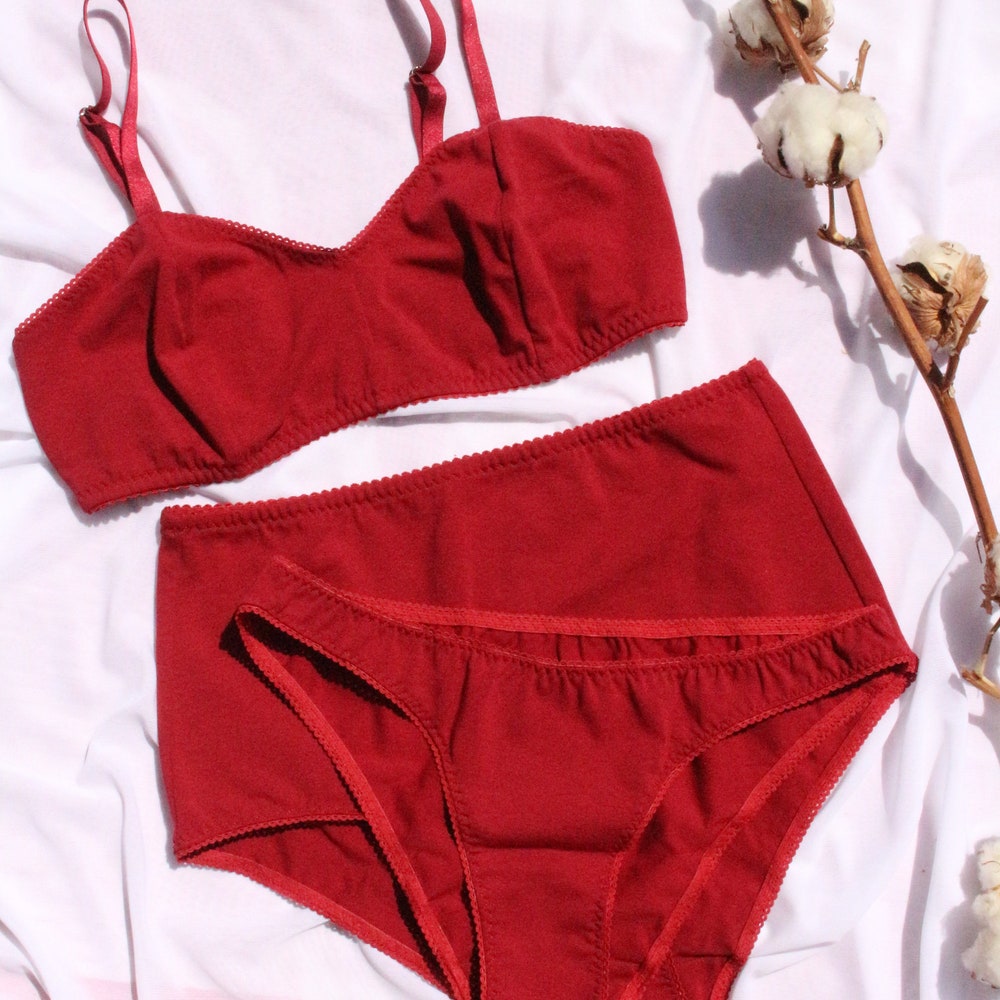 Cherry red cotton underwear set for women / Organic cotton wireless bralette / Cherry red cotton lingerie set / Cotton bralette high waisted